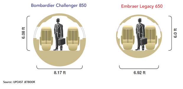 Согласно Conklin & deDecker, объем кабины Legacy 650 составляет 1656 кубических футов, а длина кабины - 49,8 фута. Challenger 850 предлагает больший объем кабины (1 964 кубических фута), но меньшую длину (на 48,4 фута). График, предоставленный UPCAST JETBOOK, показывает, что основной прирост объёма для Challenger 850, по сравнению с Legacy 650, идет за счет его ширины (8,17 фута против 6,92 фута).
