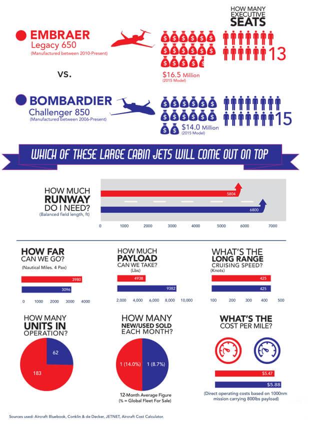 Данные, содержащиеся в таблице ниже, опубликованы в выпуске B&CA за май 2016 года, а также получены от Conklin & deDecker. Потенциальный оператор должен сосредоточиться на возможной полезной нагрузке в качестве ключевого фактора. У модели Legacy 650 «Доступная полезная нагрузка с максимальным расходом топлива» значительно больше (1909 фунтов), чем у модели Challenger 850 (358 фунтов).