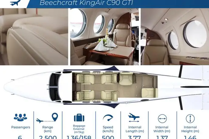 King Air C90GTi RA-07863 accommodates up to 6 passengers. The baggage compartment volume of 1.38 m³ can hold up to 4 large suitcases . The maximum flight range reaches 2446 km, depending on payload and weather conditions.
