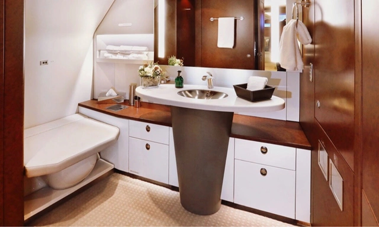 Available onboard amenities include Cabin crew , Entertainment system , Hot meal , Lavatory , Owner's approval required , Satellite phone , Shower .