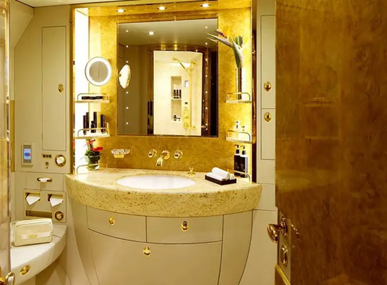 Available onboard amenities include Cabin crew , Hot meal , Lavatory , Shower .