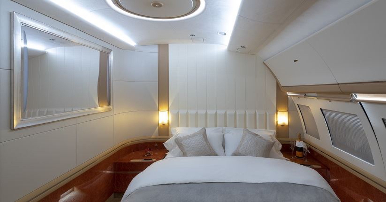 Available onboard amenities include Cabin crew , Entertainment system , Hot meal , Lavatory , Owner's approval required , Satellite phone , Shower , Wi-Fi (Satellite based) .