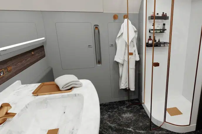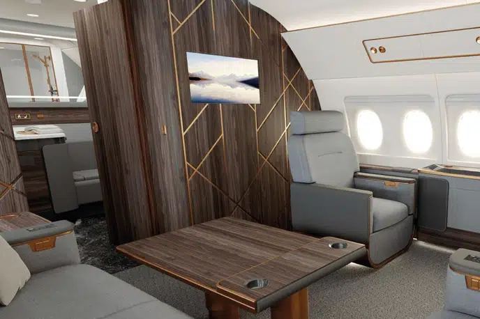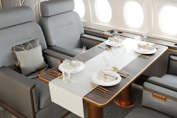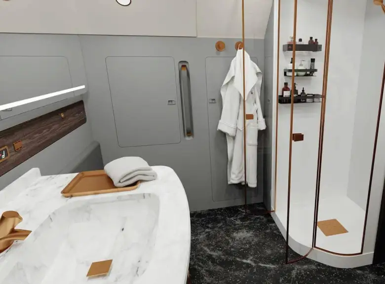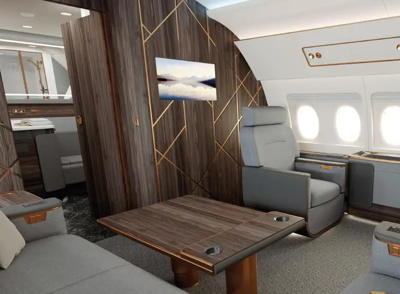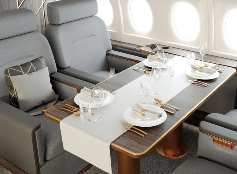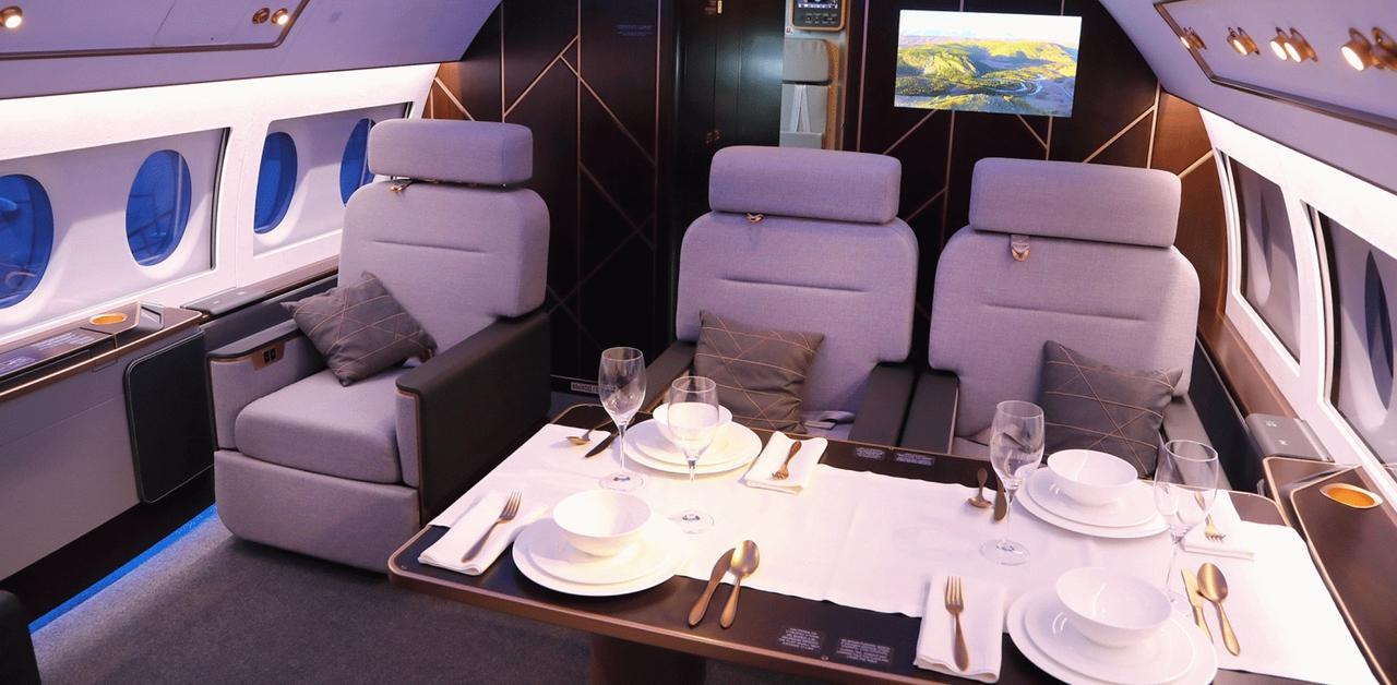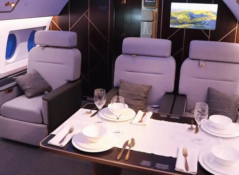 The cockpit is designed for two pilots. "The aircraft control system of the highest safety level, human participation is minimal"The base already includes reinforced cabin noise insulation, an advanced IFEC / CMS aircraft cabin management system, a kitchen, three separate bathrooms and a separate sleeping compartment. As an option, for an additional fee, the aircraft can be equipped with a retractable side ladder, a satellite communication system, a shower cabin, a Wi-Fi access point and Internet TV using the IPTV protocol.