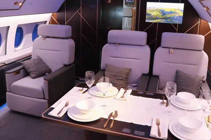 The novelty differs from its donor Sukhoi Superjet 100 in the layout and interior design. The salon is made in the best traditions of a business jet and is divided into 2 parts, in the first part there is an area for work and eating, and the second part with sofas is intended for good rest over long distances.