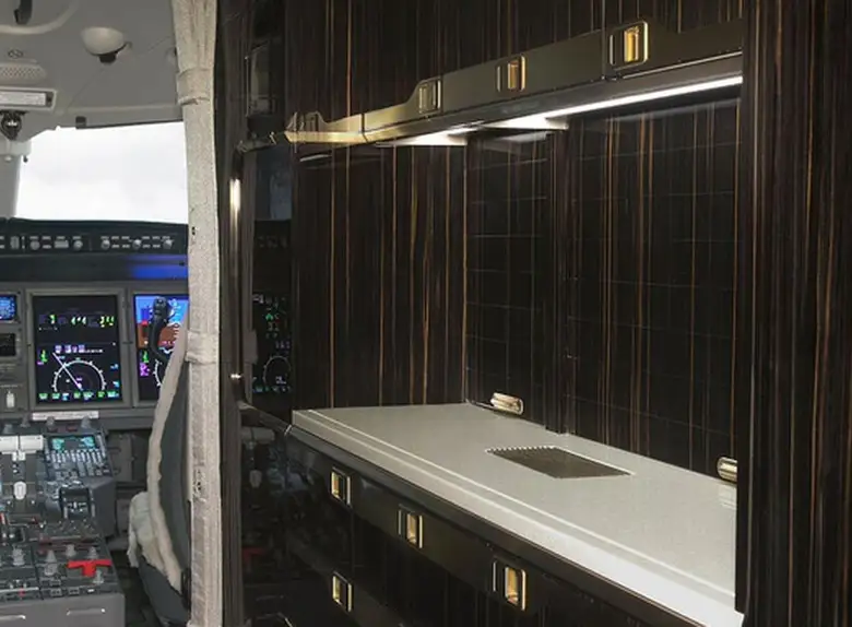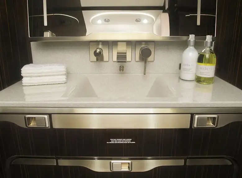 Available onboard amenities include Cabin crew , Hot meal , Lavatory , Satellite phone .