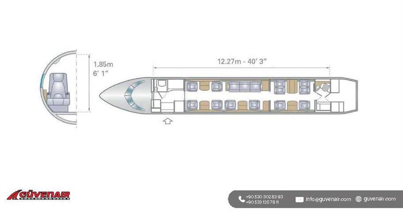 Charter availability for this aircraft is provided by GUVEN AIR. However, clients can book this jet directly through JETVIP — a professional international charter brokerage platform. We negotiate with operators, secure the best available terms, track real-time availability and ensure competitive and transparent pricing for our clients.