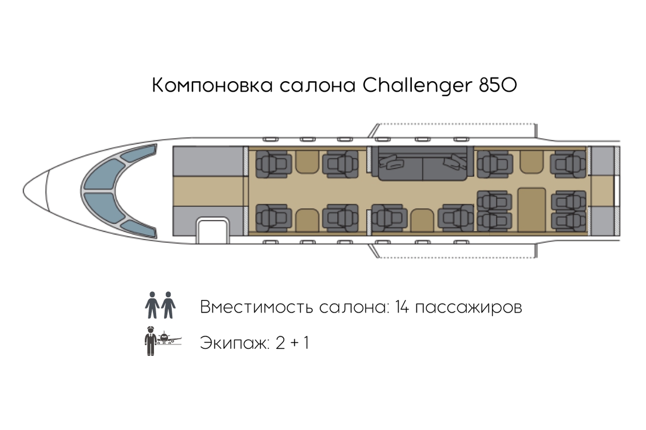 Challenger 850 RA-73532 accommodates up to 14 passengers. The baggage compartment volume of 5.52 m³ can hold up to 16 large suitcases . The maximum flight range reaches 5206 km, depending on payload and weather conditions.