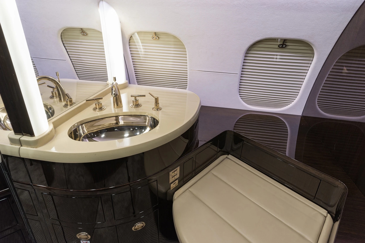 The interior is equipped with the proprietary Bombardier Vision system, including touchscreen control panels, high-speed Ka-band internet, high-definition entertainment system, and an advanced climate control system that maintains optimal humidity and pressure levels for maximum comfort during flight.
