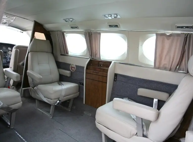 Cessna 414A N168GG . The baggage compartment volume of 0.87 m³ can hold up to 2 large suitcases . The maximum flight range reaches 2459 km, depending on payload and weather conditions.