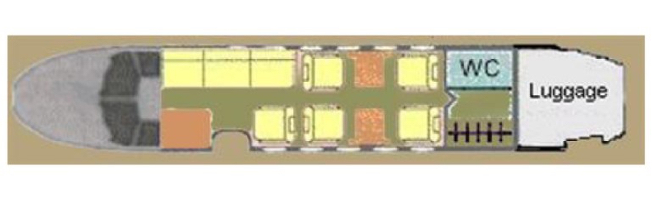 Citation II EC-HGI accommodates up to 8 passengers. The baggage compartment volume of 1.95 m³ can hold up to 5 large suitcases . The maximum flight range reaches 3232 km, depending on payload and weather conditions.