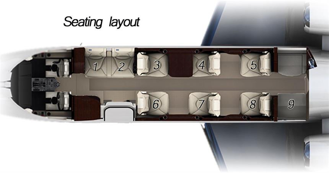 Citation VI HA-JEO accommodates up to 8 passengers. The baggage compartment volume of 2.0 m³ can hold up to 5 large suitcases . The maximum flight range reaches 4352 km, depending on payload and weather conditions.