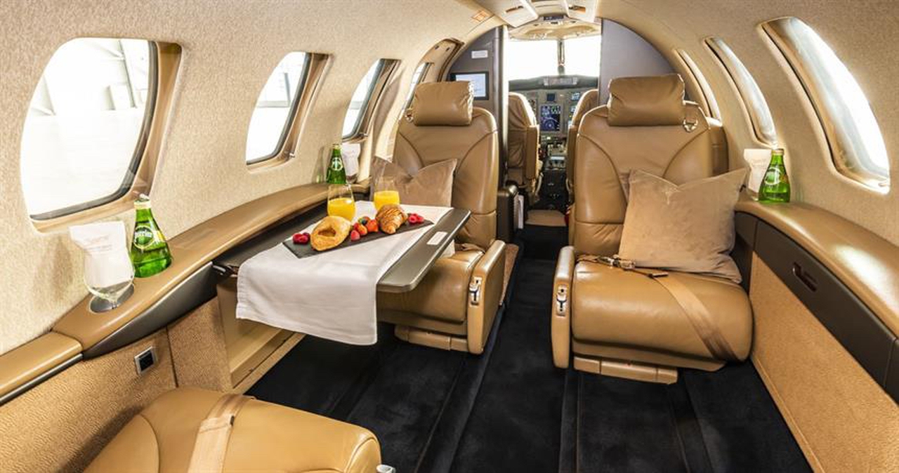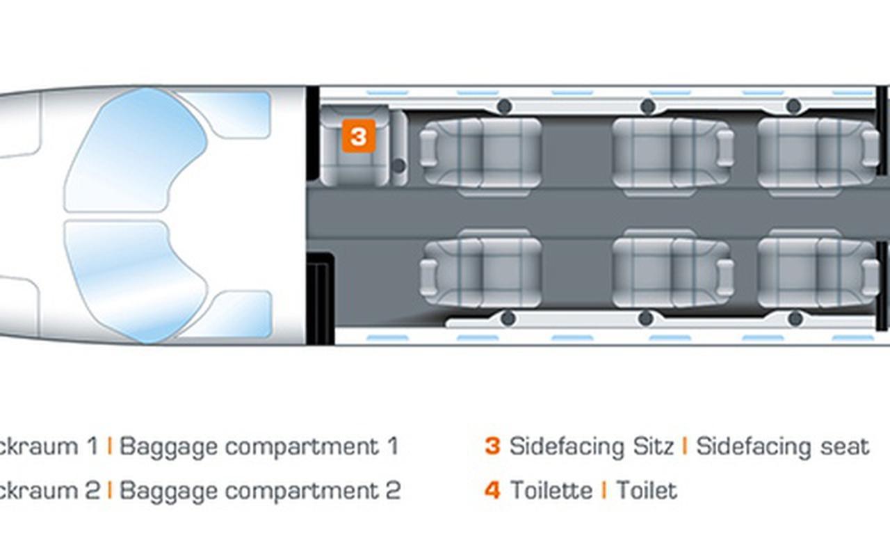 Citation CJ2+ OE-FLH accommodates up to 8 passengers. The baggage compartment volume of 2.1 m³ can hold up to 6 large suitcases . The maximum flight range reaches 2987 km, depending on payload and weather conditions.