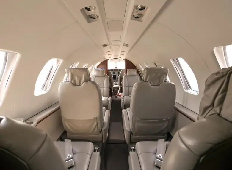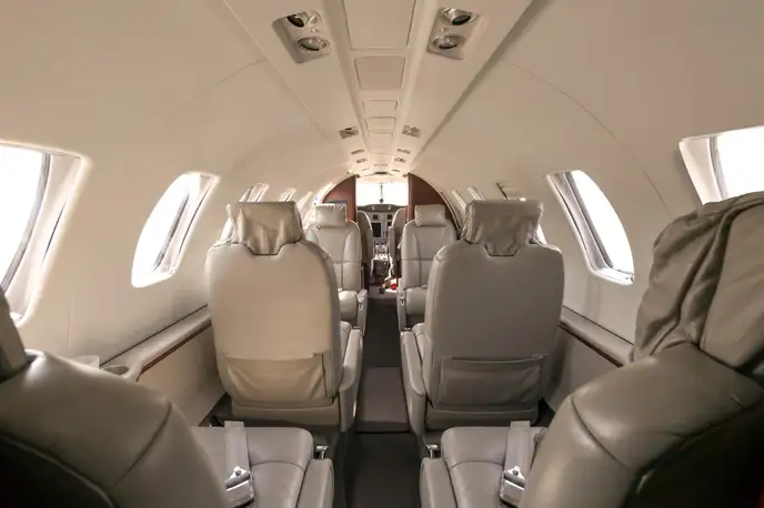 Citation CJ2+ OE-FMJ accommodates up to 6 passengers. The baggage compartment volume of 2.1 m³ can hold up to 6 large suitcases . The maximum flight range reaches 2987 km, depending on payload and weather conditions.