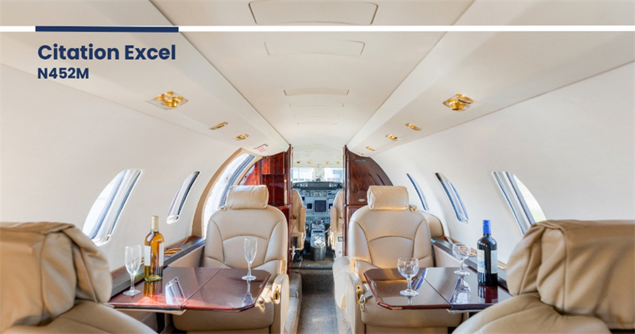 Citation Excel N452M accommodates up to 7 passengers. The baggage compartment volume of 2.24 m³ can hold up to 6 large suitcases . The maximum flight range reaches 3499 km, depending on payload and weather conditions.