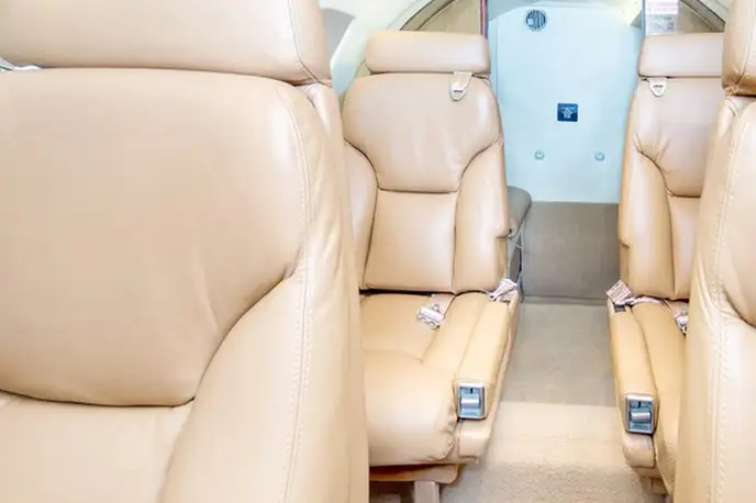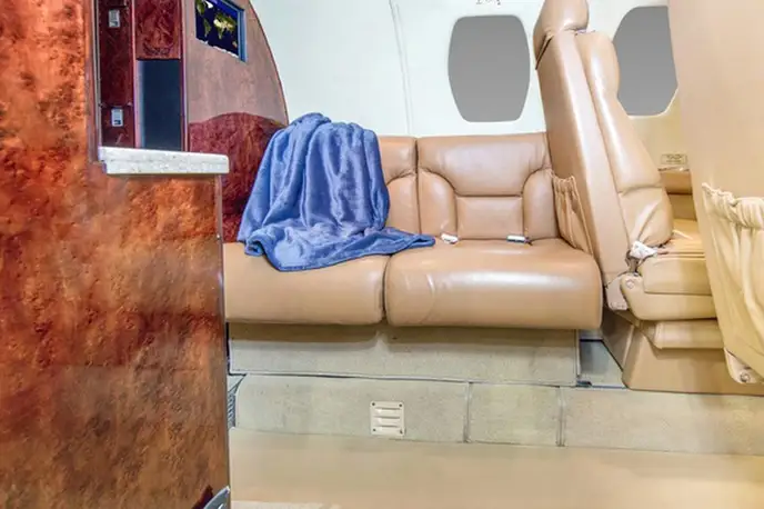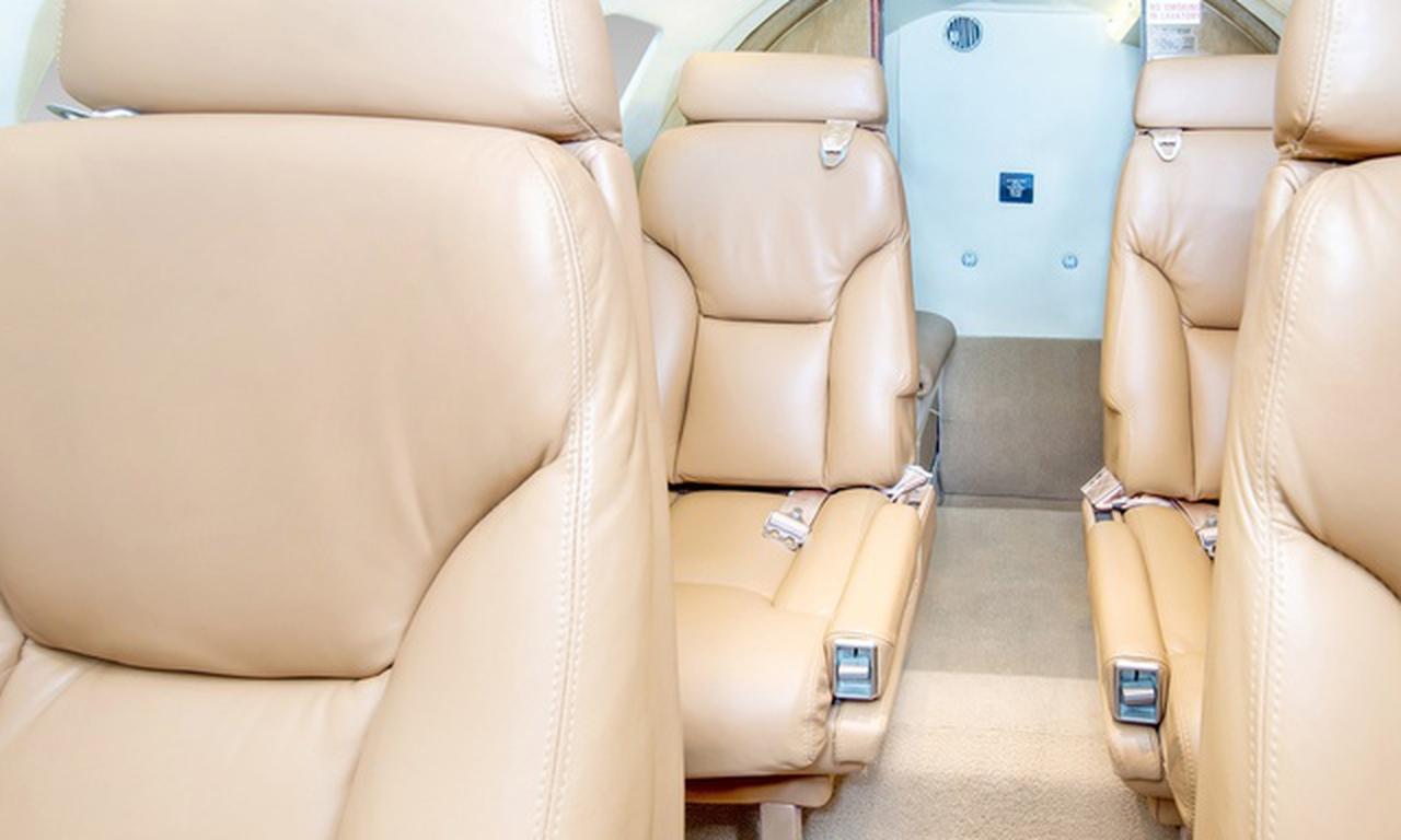 Available onboard amenities include 110V Outlet , Enclosed lavatory , Flight attendant available , Freon Air conditioning , Leather seats , Pets allowed .