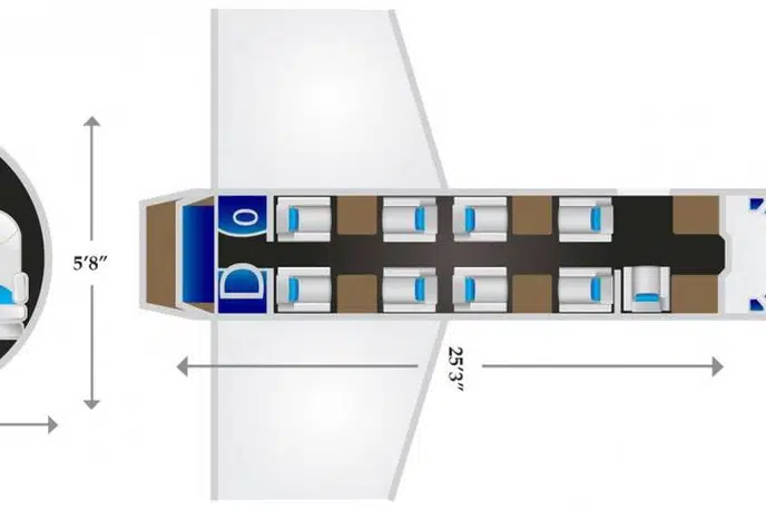 The stand-up cabin offers generous headroom, low noise levels, and luxurious seating. Passengers enjoy personal lighting, climate control, and space to work or relax.