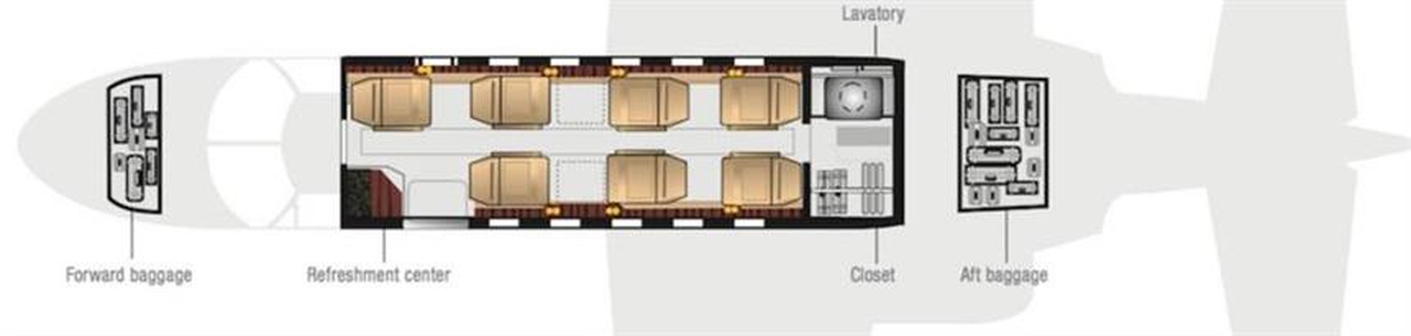 Citation Ultra EC-GOV accommodates up to 8 passengers. The baggage compartment volume of 1.9 m³ can hold up to 5 large suitcases . The maximum flight range reaches 3630 km, depending on payload and weather conditions.