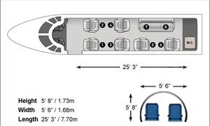 Citation X N84PJ accommodates up to 8 passengers. The baggage compartment volume of 2.93 m³ can hold up to 8 large suitcases . The maximum flight range reaches 5408 km, depending on payload and weather conditions.
