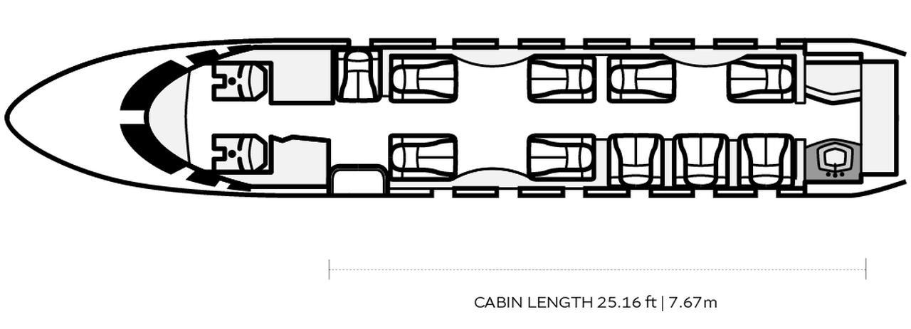 Citation XLS+ D-BOOC accommodates up to 8 passengers. The baggage compartment volume of 2.55 m³ can hold up to 7 large suitcases . The maximum flight range reaches 3440 km, depending on payload and weather conditions.