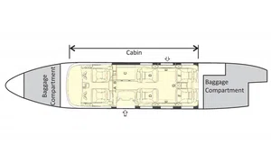 Citation XLS+ N134FM accommodates up to 9 passengers. The baggage compartment volume of 2.55 m³ can hold up to 7 large suitcases . The maximum flight range reaches 3440 km, depending on payload and weather conditions.