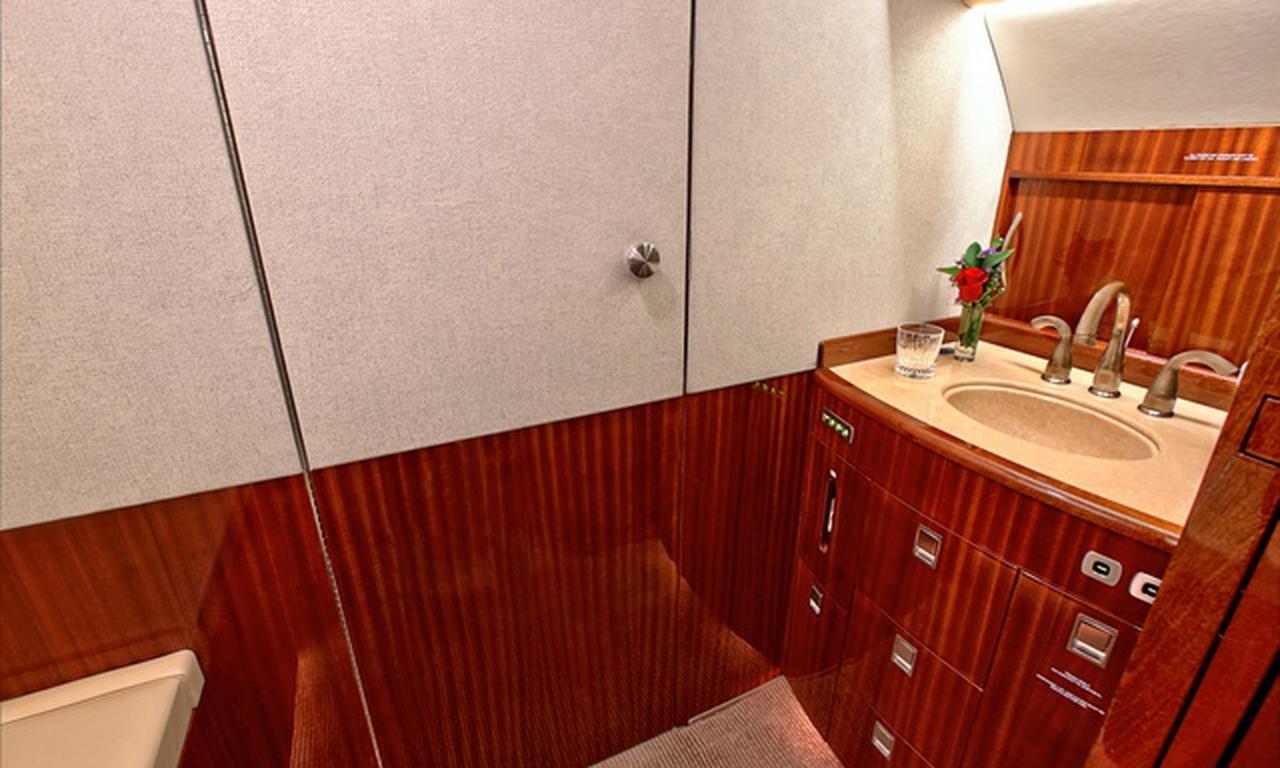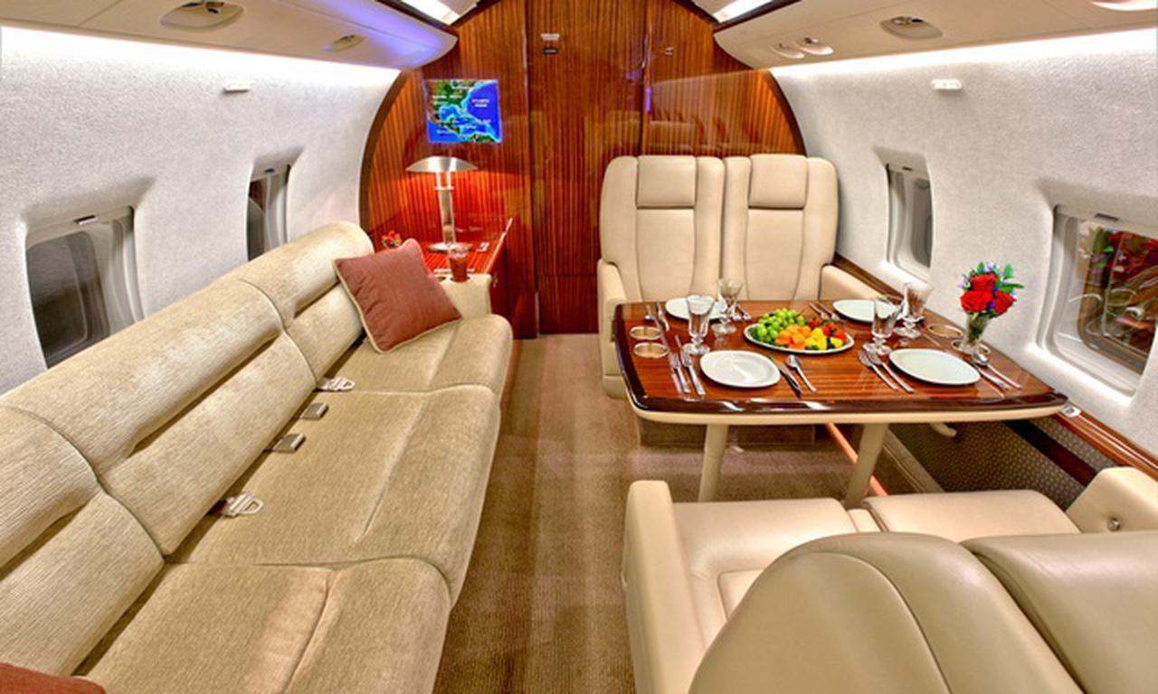 Available onboard amenities include 110V Outlet , Cabin crew , Coffee pot , Freon Air conditioning , Glassware , Hot meal , Lavatory , Lavatory sink , Leather seats , Pets allowed , Power outlet , Satellite phone , Warming oven .