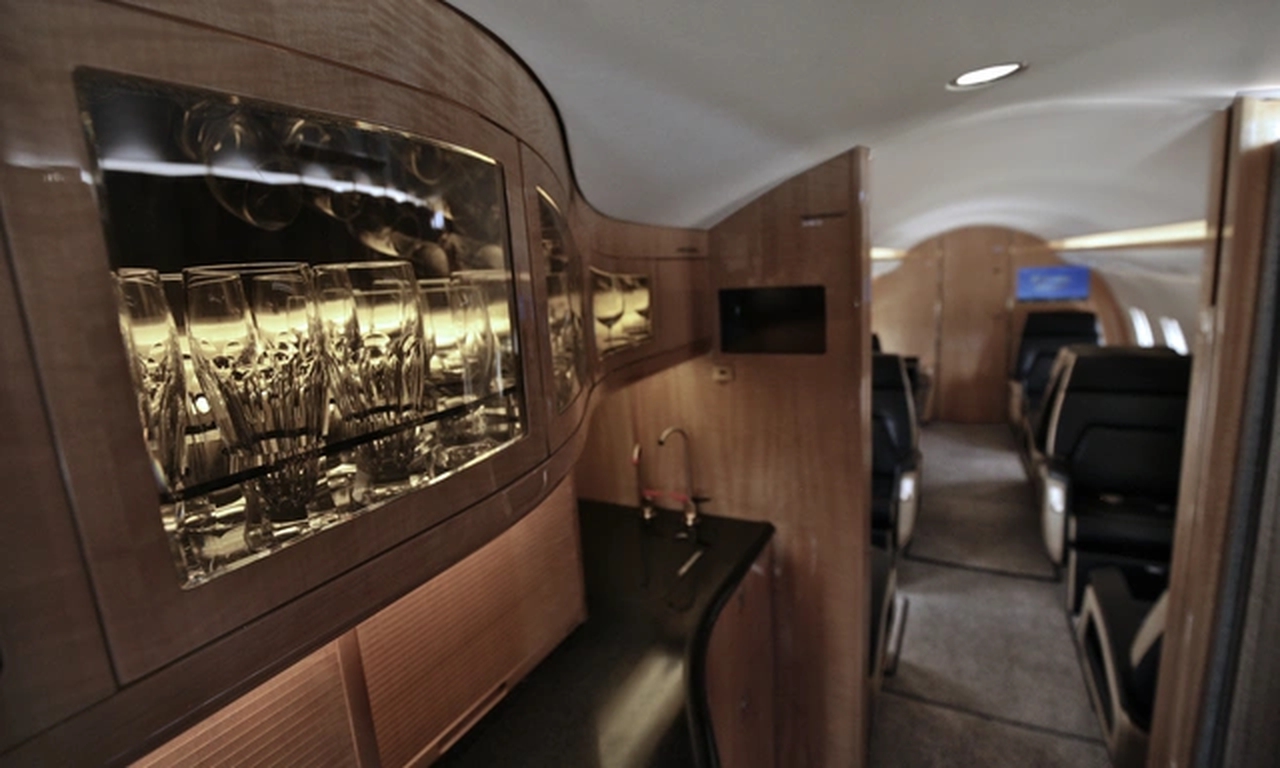 Available onboard amenities include 110V Outlet , AirShow , CD player , Coffee pot , Dishware , Freon Air conditioning , Kitchen sink , Lavatory , Leather seats , Pets allowed , Satellite phone .