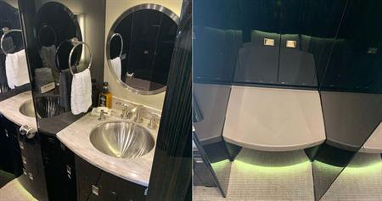 Available onboard amenities include 110V Outlet , AirShow , CD player , Cabin crew , Coffee pot , Hot meal , Kitchen sink , Lavatory , Lavatory sink , Leather seats , Microwave oven , Oven , Pets allowed , TV .