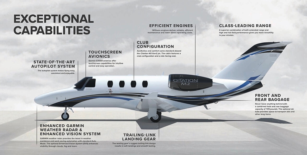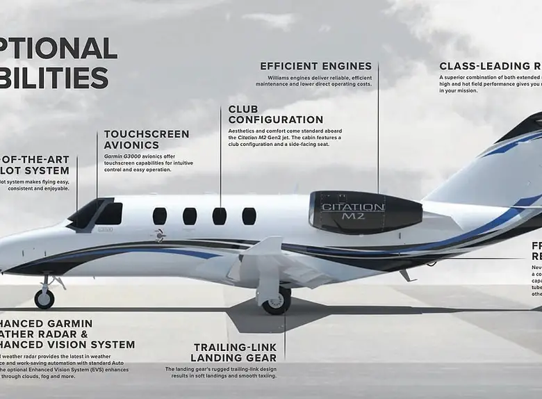 The Citation M2 represents an evolution of the successful Citation Jet lineup, combining proven reliability with cutting-edge technology. Aerodynamic improvements, modern avionics, and efficient engines make the M2 one of the most attractive offerings in the light business jet segment.