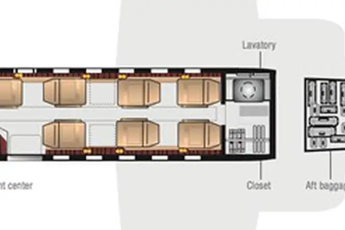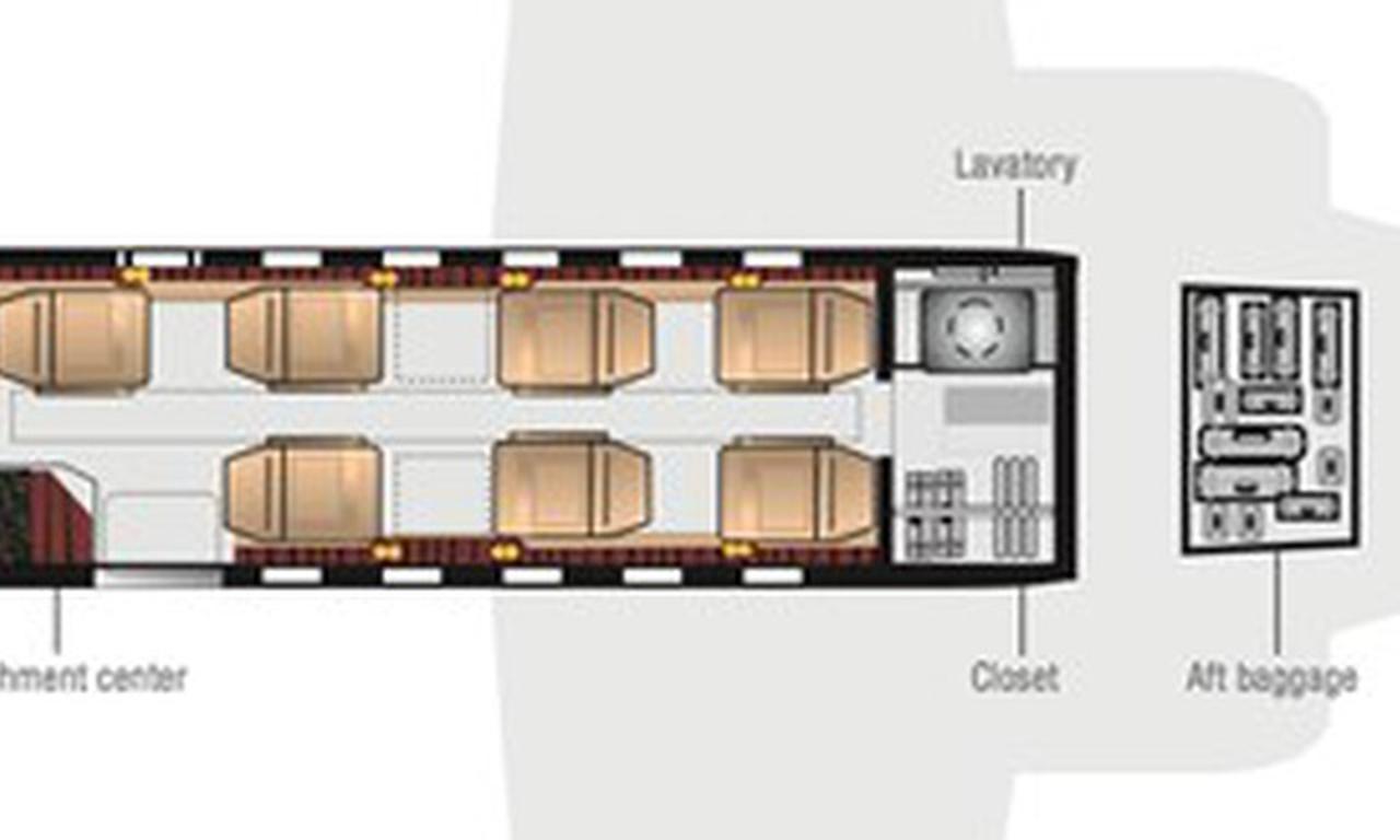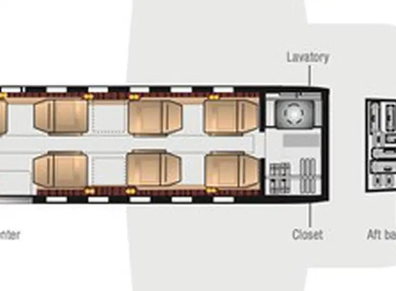 Citation Bravo N1000E accommodates up to 8 passengers. The baggage compartment volume of 2.07 m³ can hold up to 6 large suitcases . The maximum flight range reaches 3720 km, depending on payload and weather conditions.