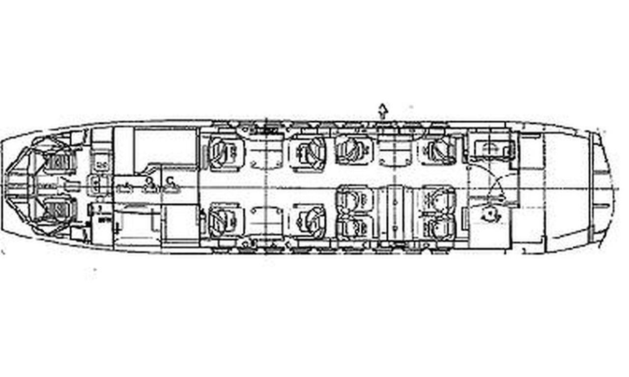 Falcon 2000 EC-HYI accommodates up to 10 passengers. The baggage compartment volume of 3.7 m³ can hold up to 11 large suitcases . The maximum flight range reaches 5778 km, depending on payload and weather conditions.