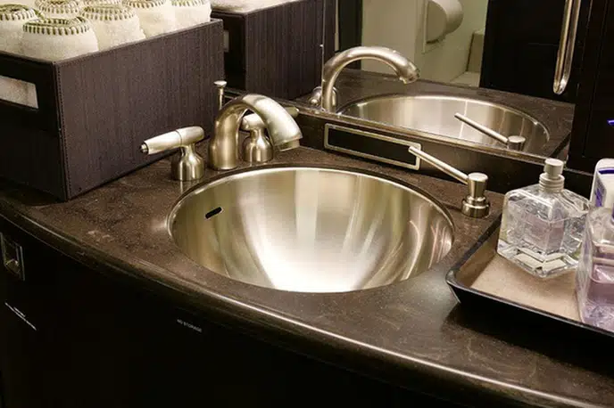 Available onboard amenities include Cabin crew , Hot meal , Lavatory , Satellite phone .