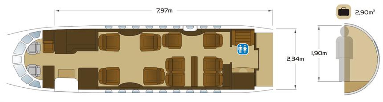 Falcon 2000ЕХ PH-VBG accommodates up to 10 passengers. The baggage compartment volume of 3.7 m³ can hold up to 11 large suitcases . The maximum flight range reaches 7037 km, depending on payload and weather conditions.