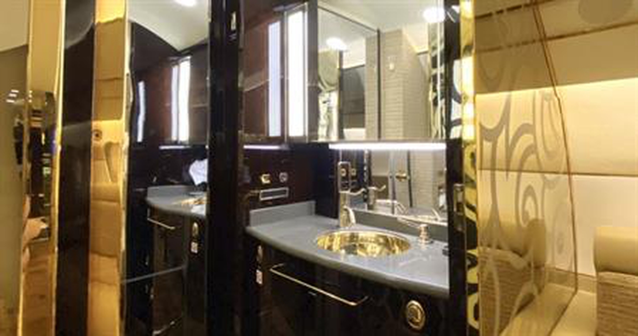 Available onboard amenities include AirShow , Coffee pot , Convection oven , Full galley , IPOD station , Ice bin , Lavatory , Leather seats , Microwave oven , Pets allowed , Power outlet , Video monitors .