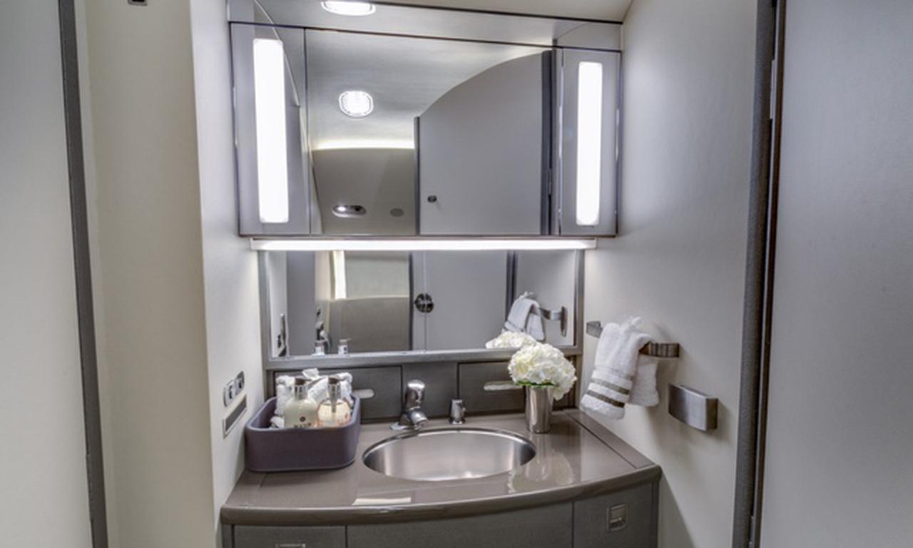 Available onboard amenities include Cabin crew , Hot meal , Lavatory , Satellite phone .
