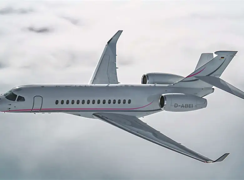 Falcon 6X D-ABEI accommodates up to 10 passengers. The baggage compartment volume of 4.4 m³ can hold up to 13 large suitcases . The maximum flight range reaches 9633 km, depending on payload and weather conditions.
