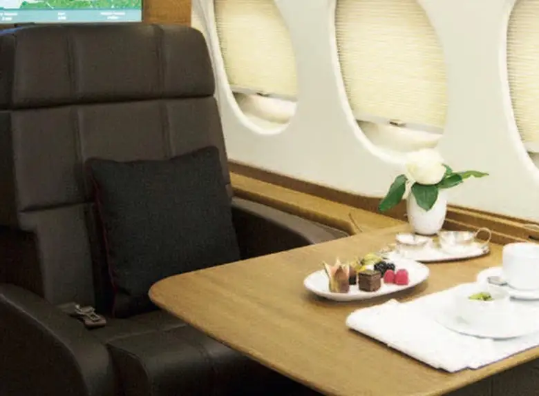 Available onboard amenities include Cabin crew , Hot meal , Lavatory , Satellite phone .