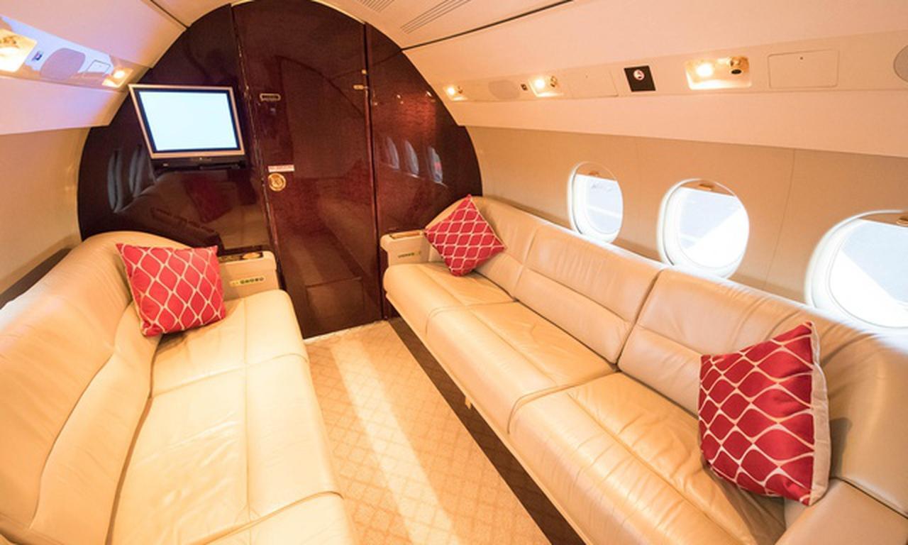 Available onboard amenities include 110V Outlet , AirShow , CD player , Cabin crew , Cabin server , Coffee pot , Convection oven , DVD player , Dishware , Enclosed lavatory , Flatware , Freon Air conditioning , Full galley , Glassware , Headsets , Hot meal , Kitchen sink , Lavatory , Lavatory sink , Leather seats , Microwave oven , Pets allowed , Power outlet , Satellite phone , Vacuum toilet .