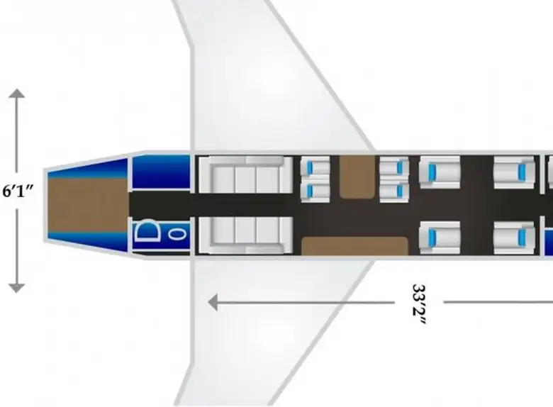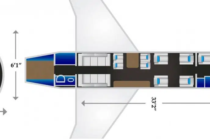 14 pax, 4 club fwd with pneumatic leg rests, dining group with opposite credenza, 2 ea. 3 seat sofas (10" electrically berthable). Erda jump seat. Fwd and Aft lavatories. Galley pocket door, mid-cabin tracking curtain, electrical table.