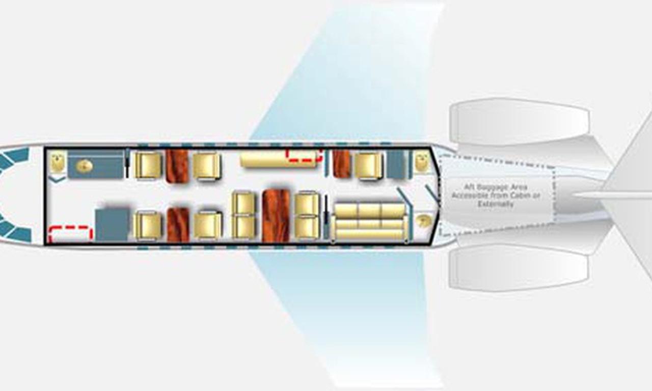 Falcon 900EX N592CL accommodates up to 14 passengers. The baggage compartment volume of 3.6 m³ can hold up to 10 large suitcases . The maximum flight range reaches 8334 km, depending on payload and weather conditions.