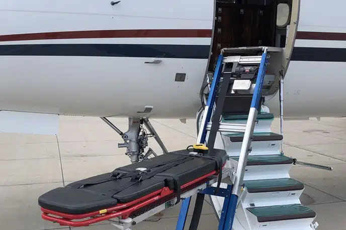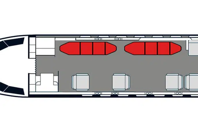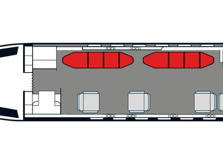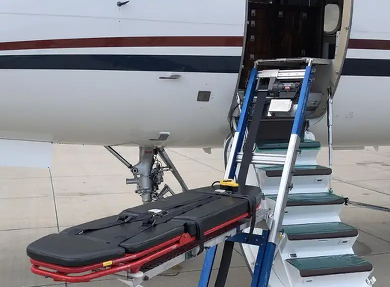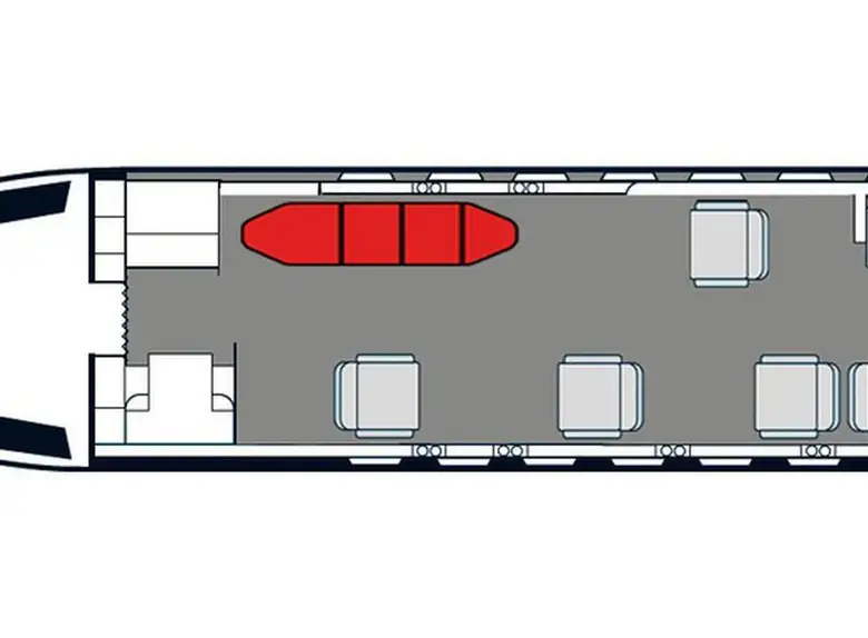 Available onboard amenities include Adult critical care , Hot meal , Lavatory , Medical ramp .