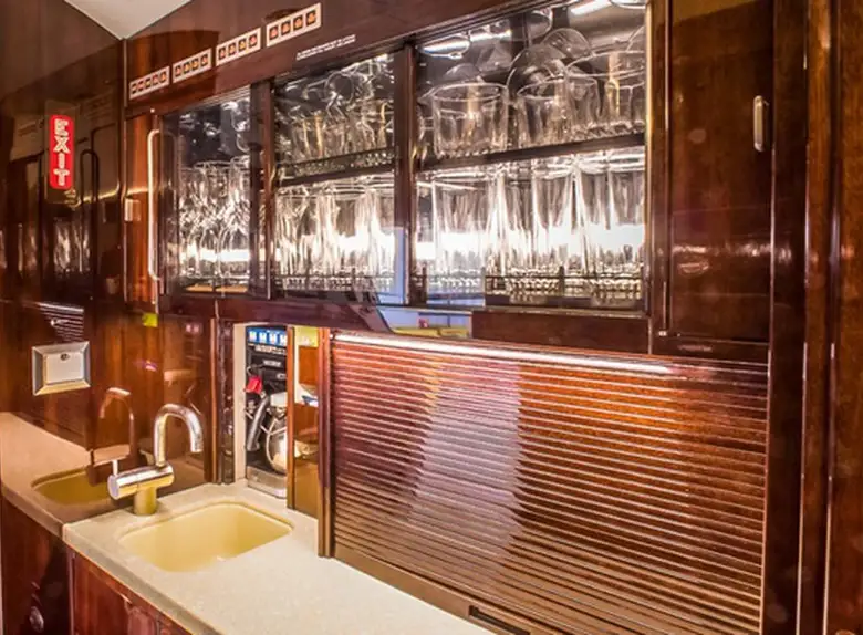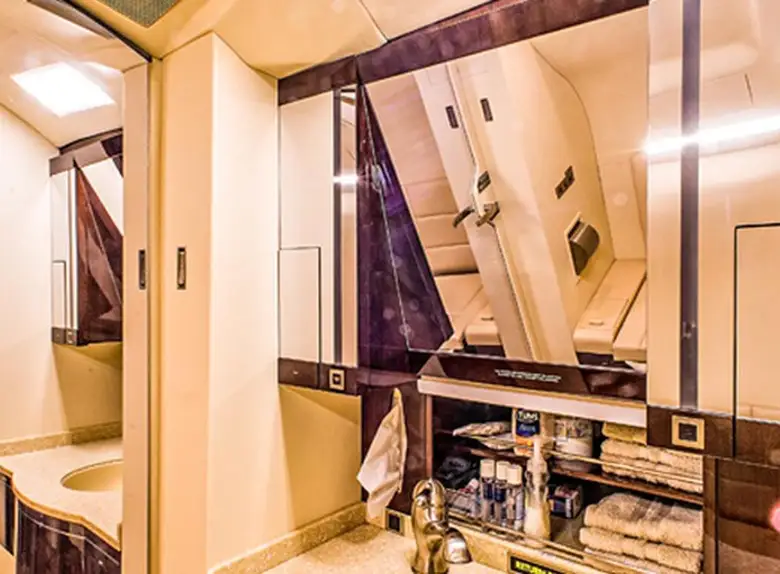 Available onboard amenities include Cabin crew , Hot meal , Lavatory , Satellite phone .
