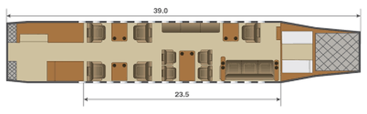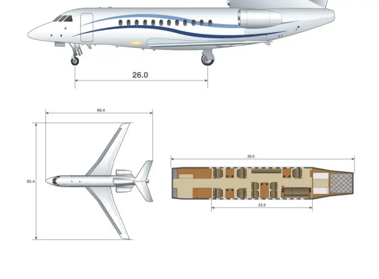 The Falcon 900C is a Heavy Jet private jet designed for up to 19 passengers offering a flight range of up to 7408 km. JETVIP provides Falcon 900C charter services worldwide with an average hourly rate starting from 6500 €. On this page you will find full aircraft specifications, cabin layouts, photos. Model ratings: Reliability — 92/100, Comfort — 90/100, Popularity — 4.2/5.