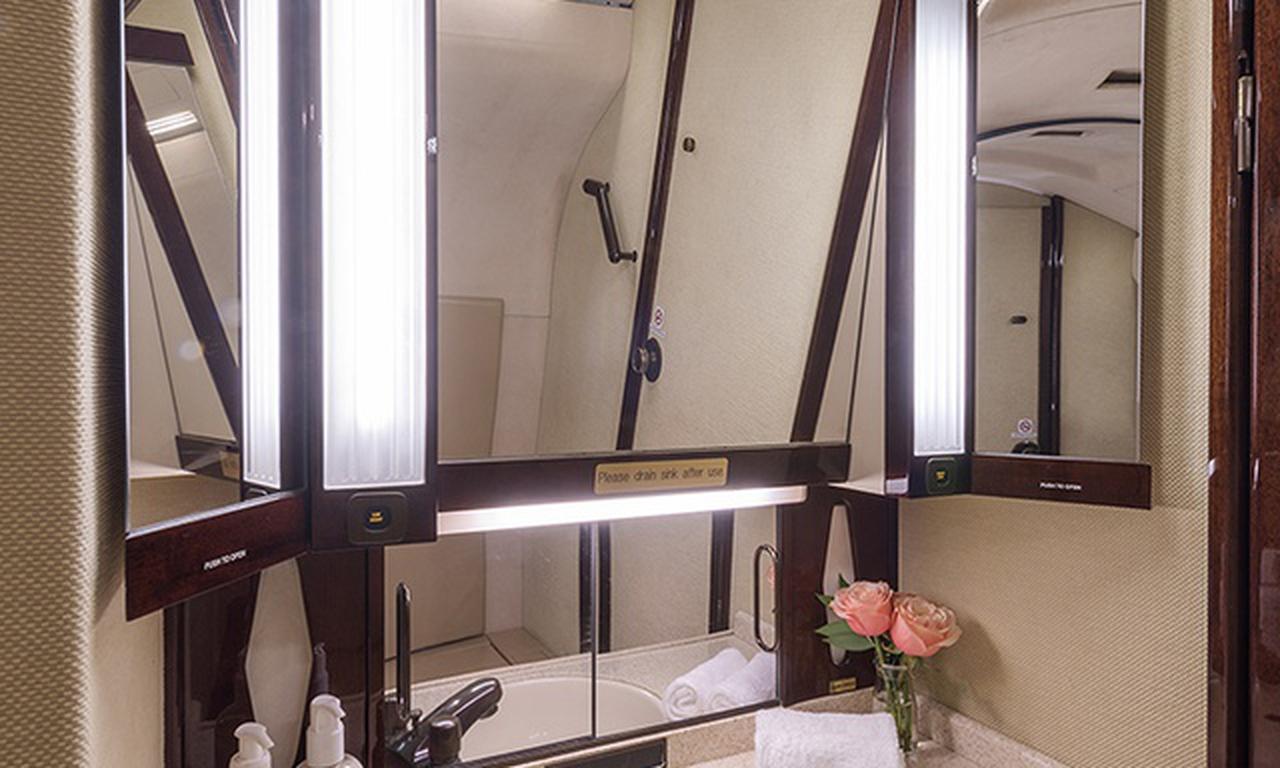 Available onboard amenities include Cabin crew , Hot meal , Lavatory , Satellite phone .