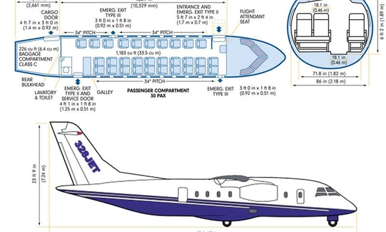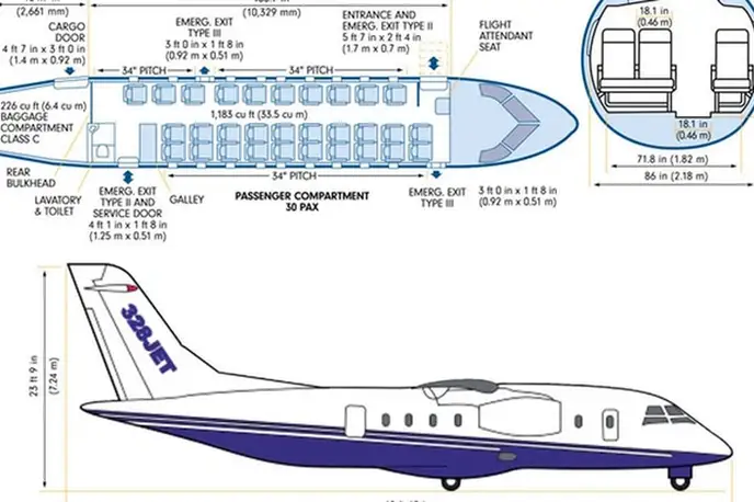 Dornier 328 N100UJ . The baggage compartment volume of 7.38 m³ can hold up to 22 large suitcases . The maximum flight range reaches 6300 km, depending on payload and weather conditions.