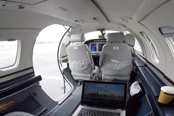 Eclipse 500 N619RJ accommodates up to 4 passengers. The baggage compartment volume of 0.45 m³ can hold up to 1 large suitcases . The maximum flight range reaches 2584 km, depending on payload and weather conditions.