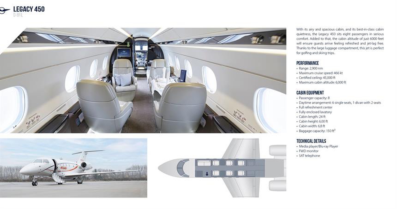 Legacy 450 D-BFIL accommodates up to 8 passengers. The baggage compartment volume of 4.8 m³ can hold up to 14 large suitcases . The maximum flight range reaches 5788 km, depending on payload and weather conditions.