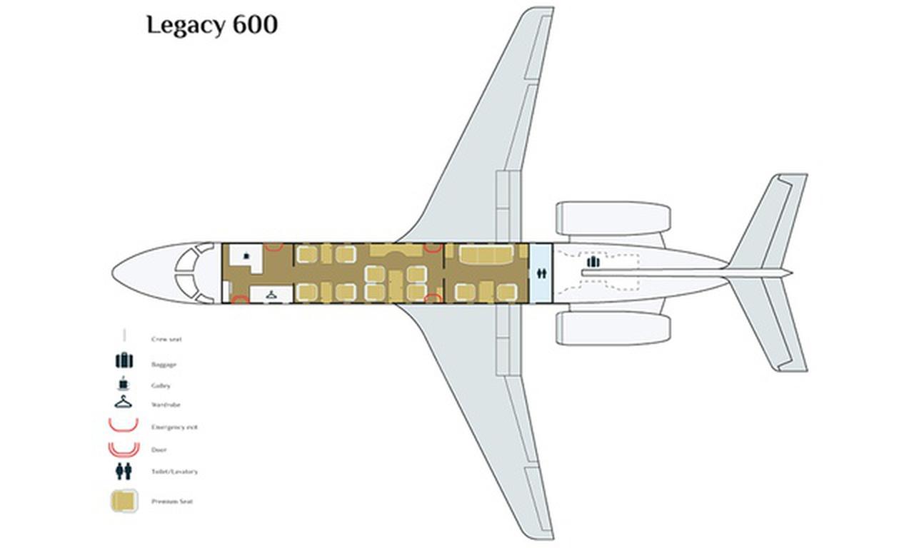 Legacy 600 F-HFKD accommodates up to 13 passengers. The baggage compartment volume of 6.8 m³ can hold up to 20 large suitcases . The maximum flight range reaches 6019 km, depending on payload and weather conditions.