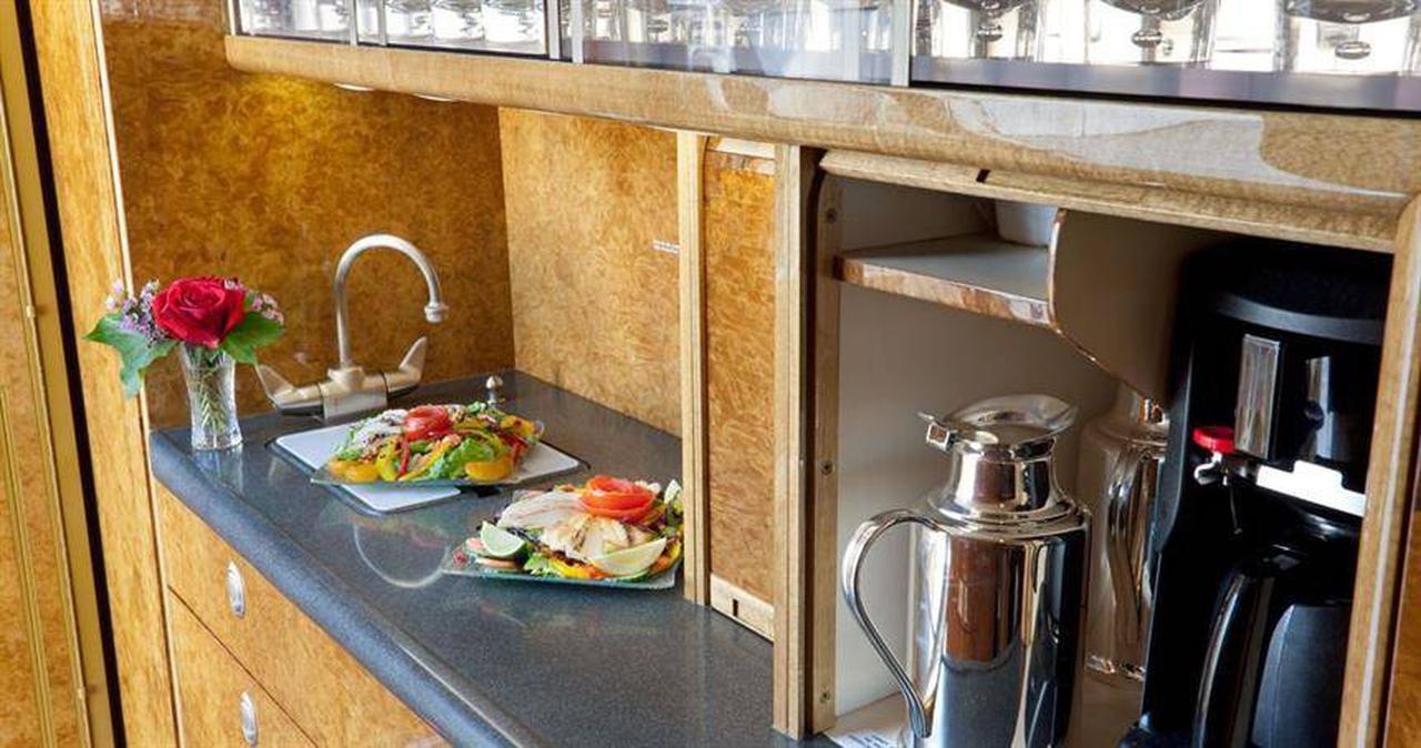 Available onboard amenities include Cabin crew , Hot meal , Lavatory , Satellite phone .
