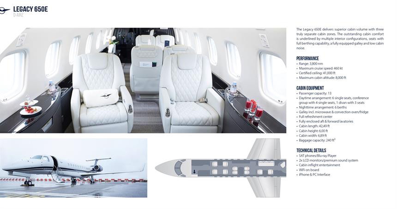 Legacy 650E D-AIRZ accommodates up to 13 passengers. The baggage compartment volume of 6.8 m³ can hold up to 20 large suitcases . The maximum flight range reaches 7370 km, depending on payload and weather conditions.