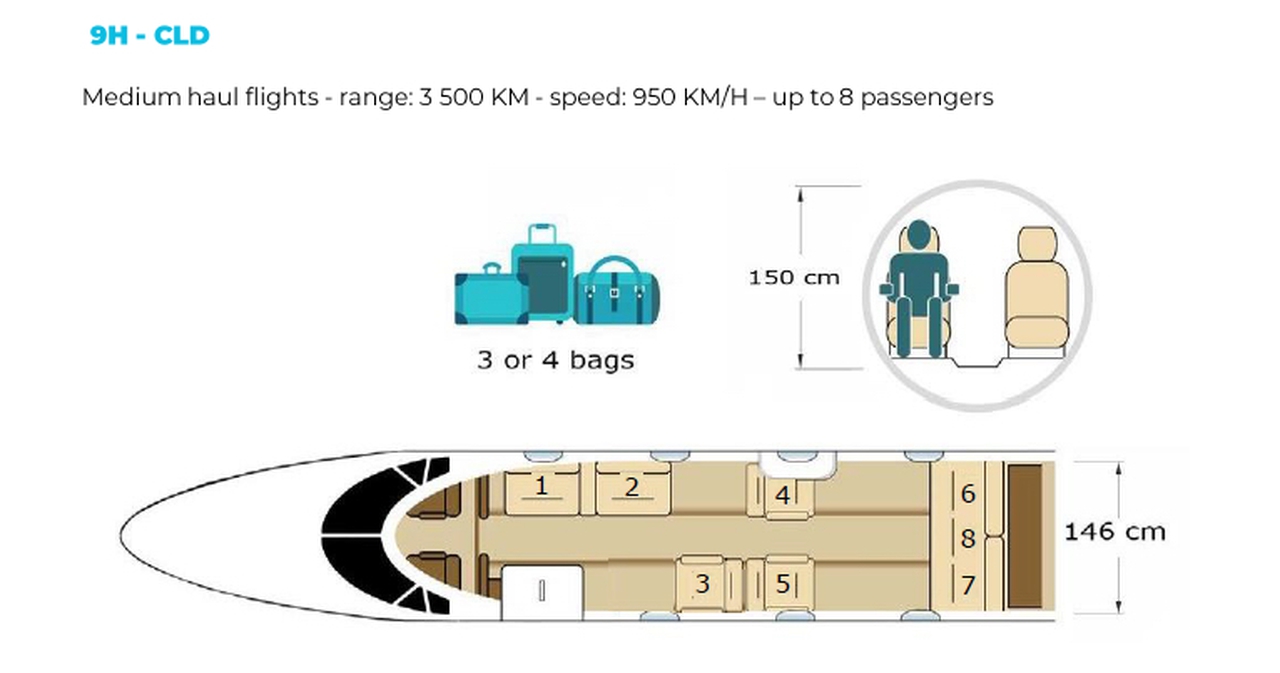 To check the availability and charter rates of 9H-CLD, contact JETVIP — we will provide the best offer tailored to your trip.